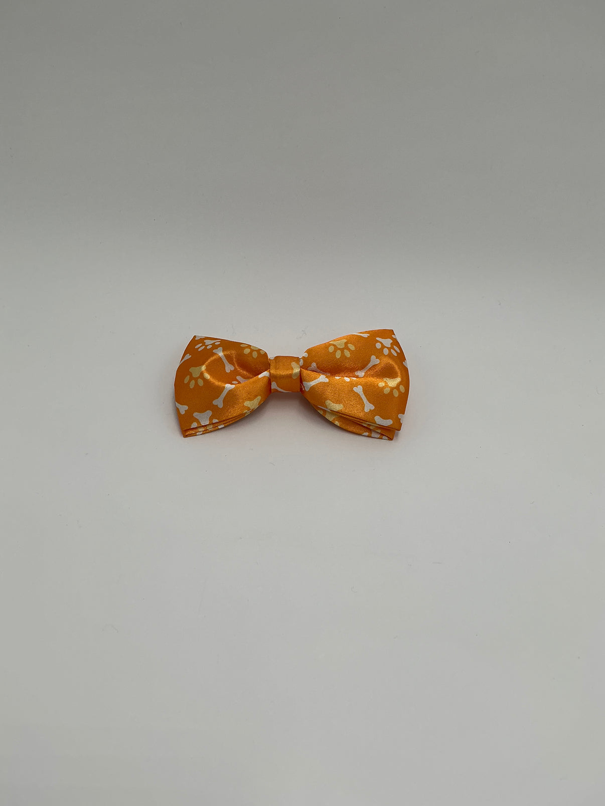 Add a touch of charm to your pup’s look with this silky orange bow tie collar attachment! Featuring an adorable white paw and bone pattern, this accessory easily slides onto most standard collars, giving your dog a polished and playful look in seconds.