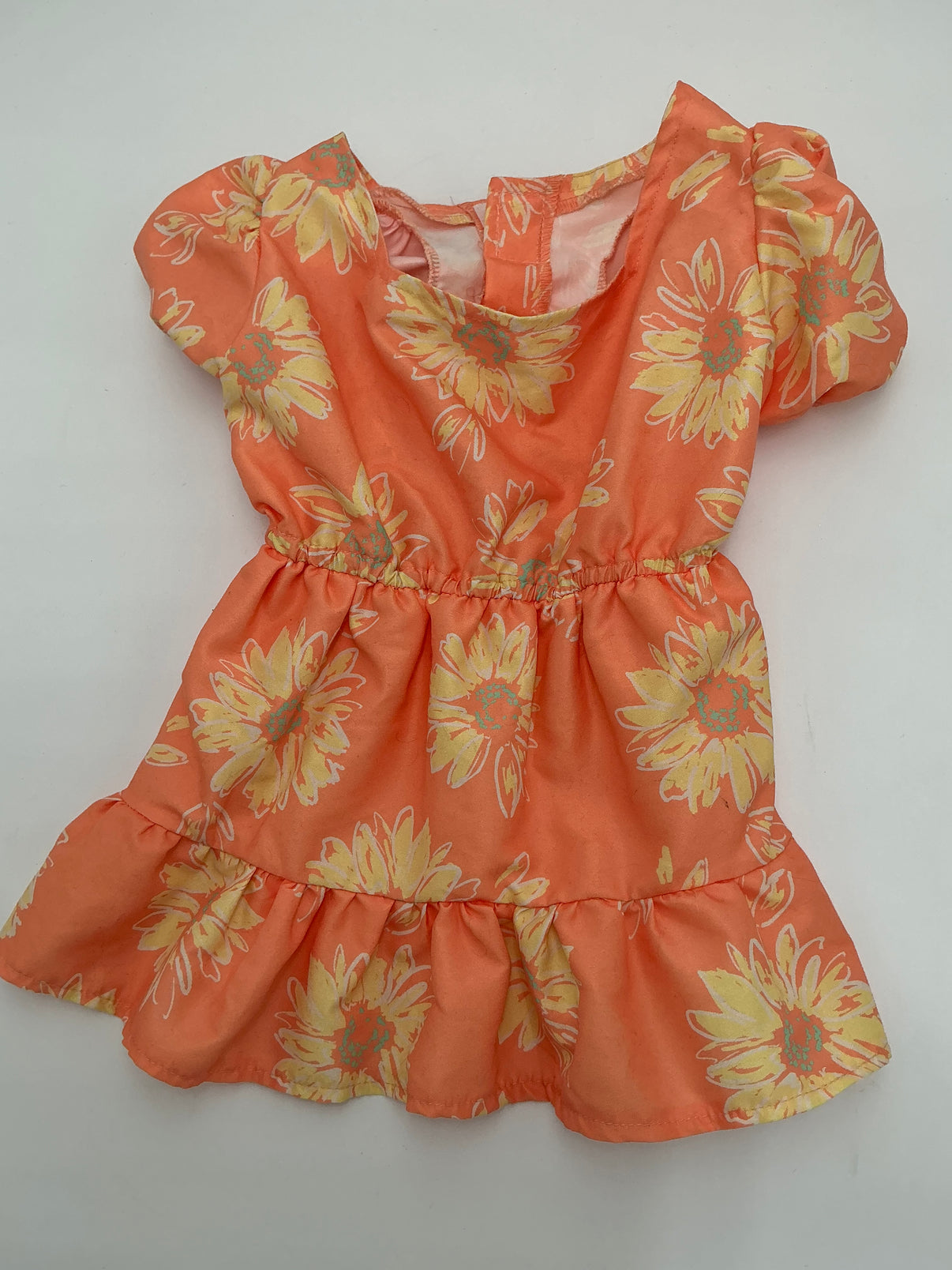 Add a touch of sweetness to your pet's wardrobe with this charming peach floral dress. Featuring a vibrant sunflower-inspired print and a ruffled silhouette, this dress is designed for both comfort and style. The underside includes a soft tulle layer to give the skirt a gentle "poof" without being restrictive.
