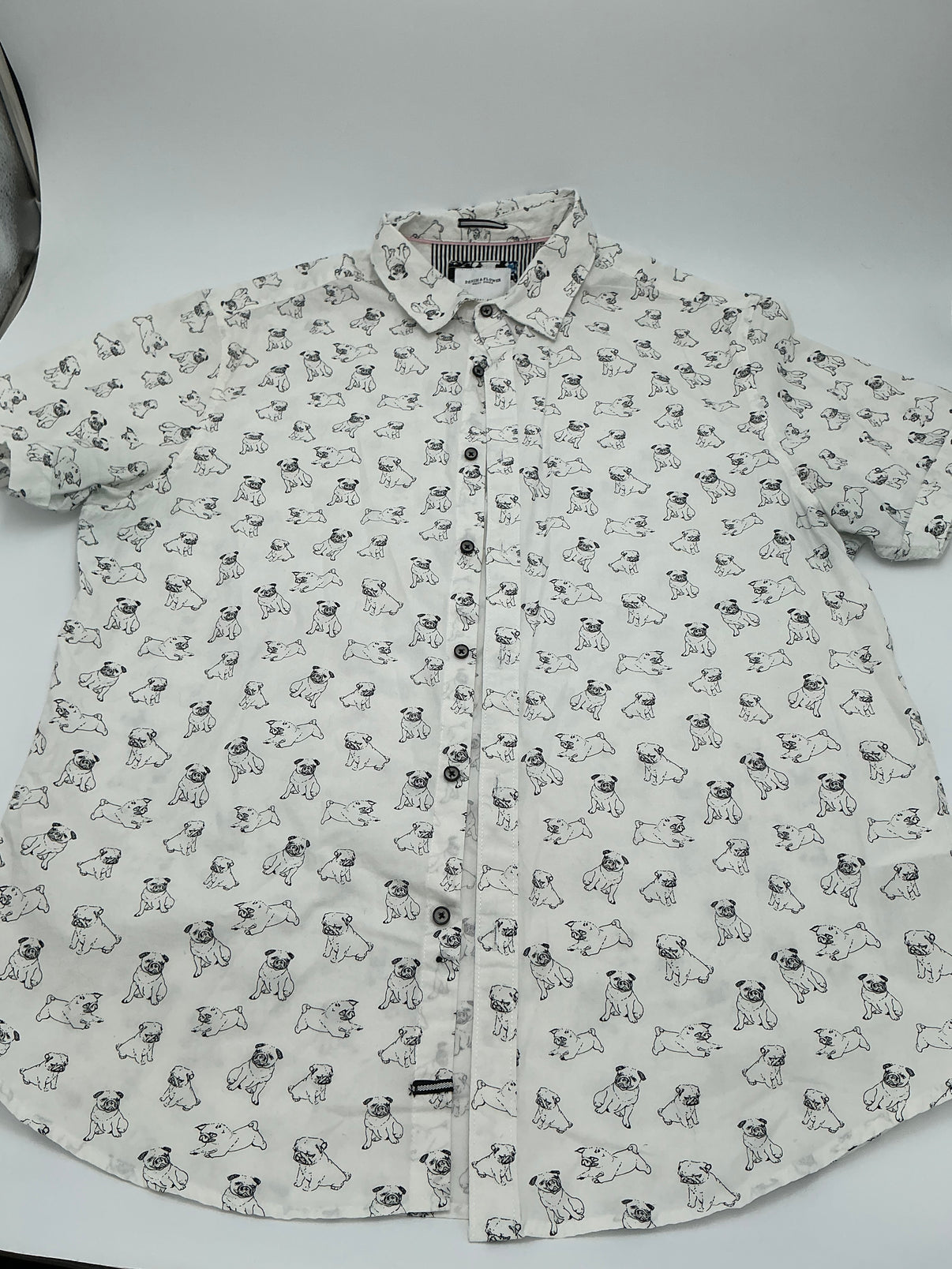 Denim & Flower Pug Print Button-Up Shirt- Large- White