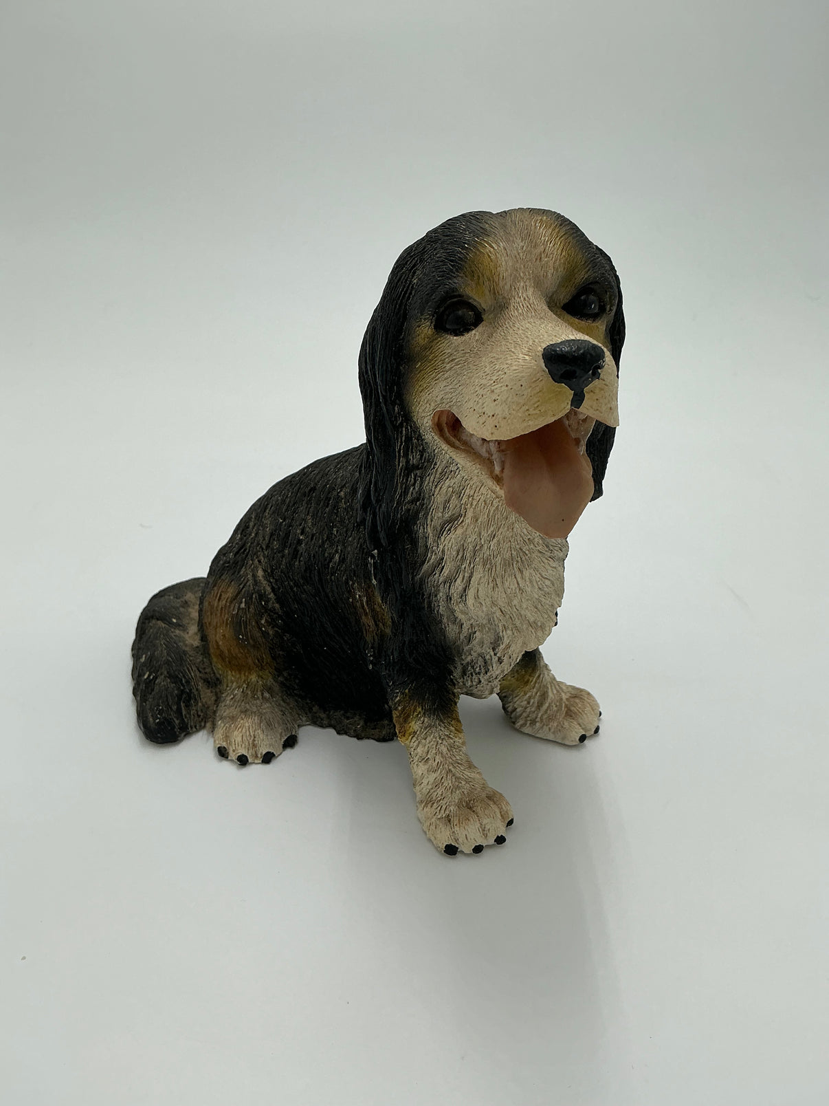 A charming and lifelike figurine that brings a touch of canine companionship to your garden, patio, bookshelf, or entry table! This sitting pup, which resembles a Spaniel or mix, features a happy, panting expression.