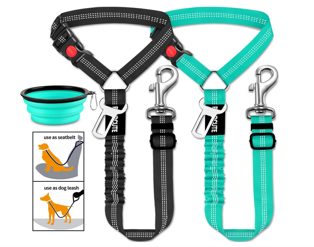 3 Piece Dog Car Seat Belt Set- 2 Bungee Belts, 1 Bowl