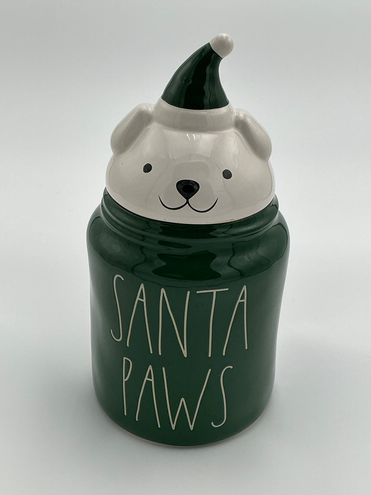 🐾 Festive Design: Deep green jar with white Rae Dunn lettering that reads “SANTA PAWS.”